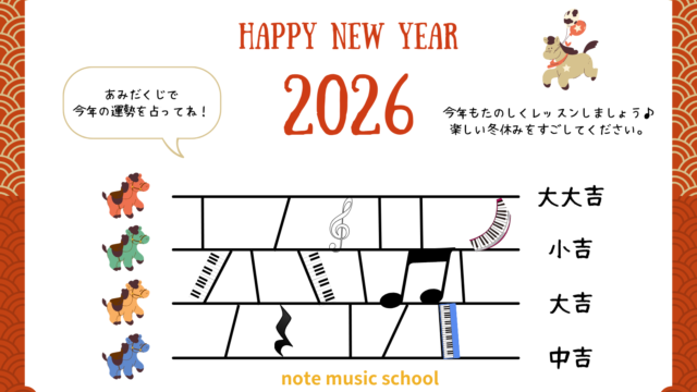 ブログ 明けましておめでとうございます。空き枠のご案内も… 2026年1月5日 note-music.info NOTE MUSIC SCHOOL ピアノ教室 2026になりましたね。 今年もノートミュージックスクールは、生徒の皆さんと、音楽やピアノを通して前向きで楽しい時間を共有で …