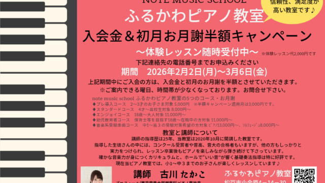 ブログ 新規入会キャンペーンのお知らせ 2026年1月10日 note-music.info NOTE MUSIC SCHOOL ピアノ教室 2026年2月2日(月)〜3月6日(金)の期間、新規ご入会の方は 入会金&初月お月謝半額を半額にさせていただきます。 一緒にピアノを楽しみませんか? 現在、下記 …